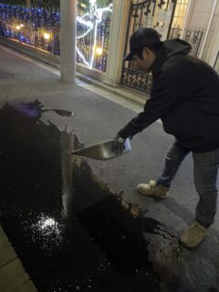 ほうきで掃くだけでは、アスファルトの隙間に入り込んだ細かな粉塵までは取れません。私たちは現場最終日に、高圧洗浄機や水撒きによる「水洗い」を行います。乾いた後の道路が白っぽくならず、元通りの黒々としたアスファルトに戻るまでが私たちの仕事です。